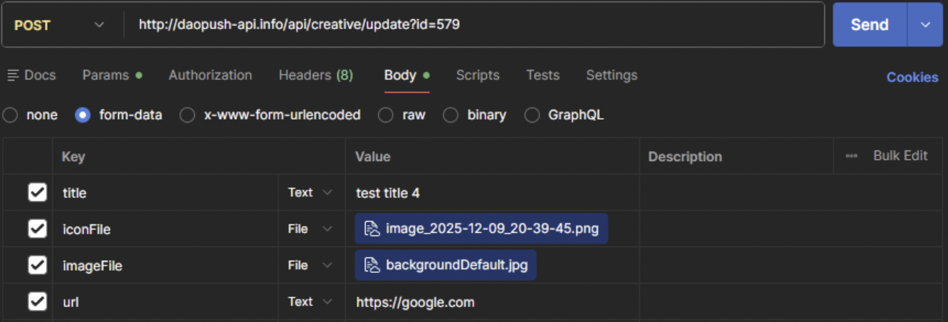 Requests that support the POST method can accept input parameters in JSON format. In this case, the request header Content–type: application/json must be specified. The request body must contain valid JSON encoded in utf-8. The exception is POST requests where a file must be passed, for example images for a creative.