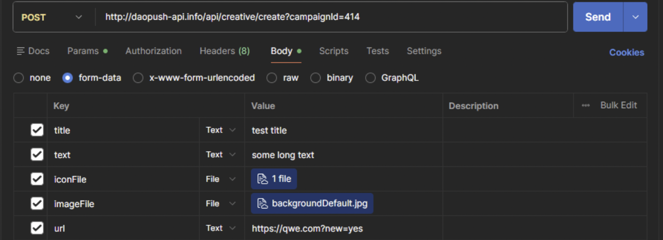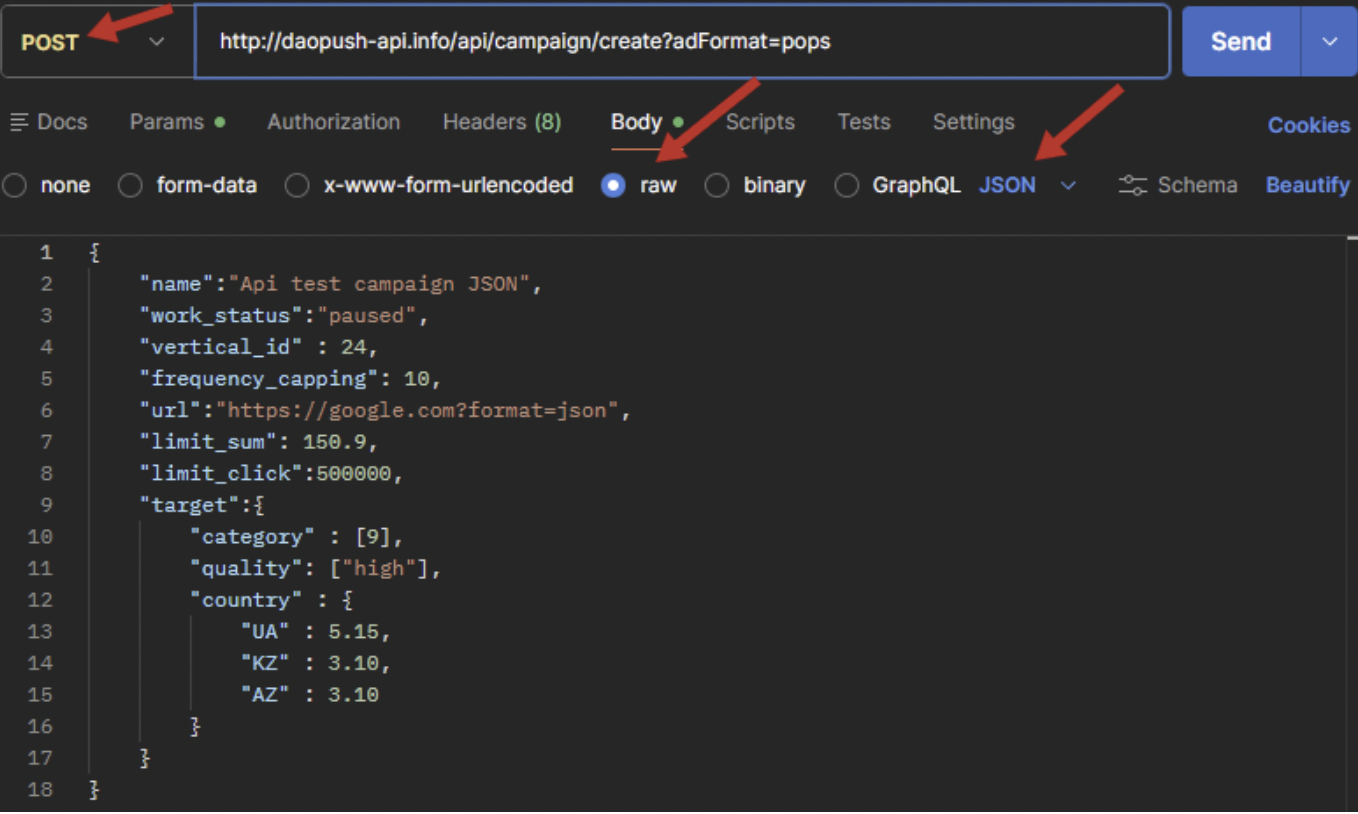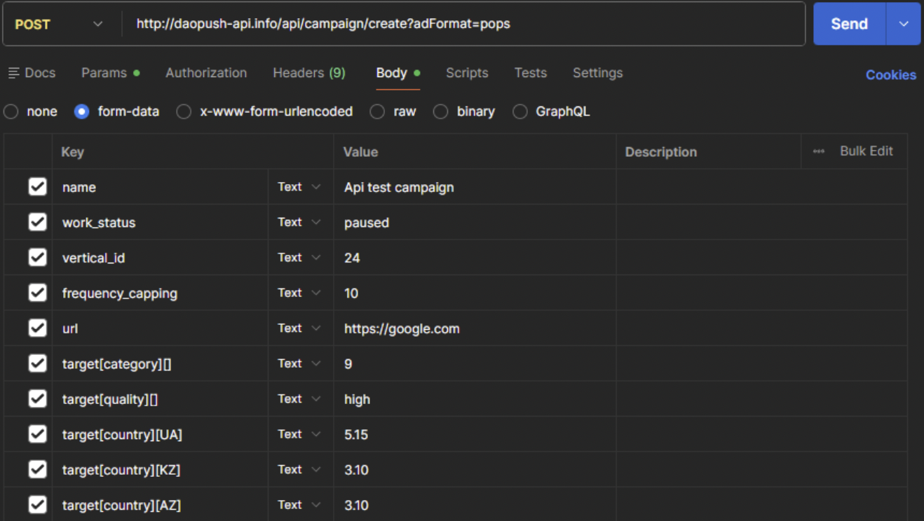 curl 'http://daopush-api.info/api/campaign/create?adFormat=pops&api-key=••••••' \