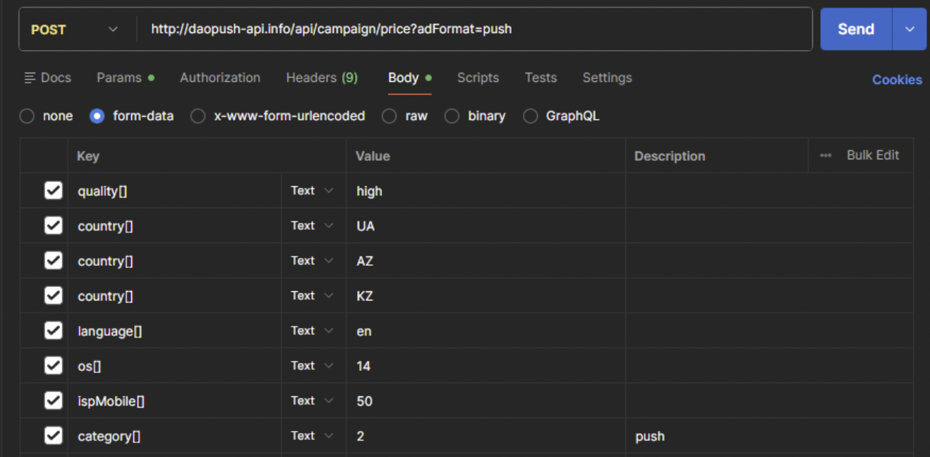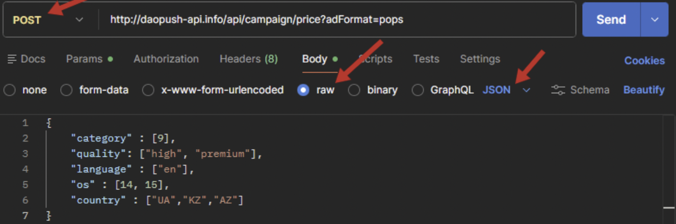 POST http://daopush-api.info/api/campaign/price?api-key={xxxxx-key}&adFormat=pops